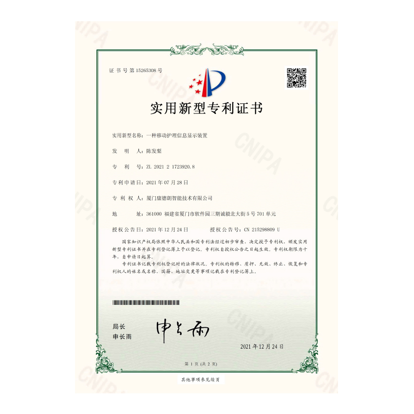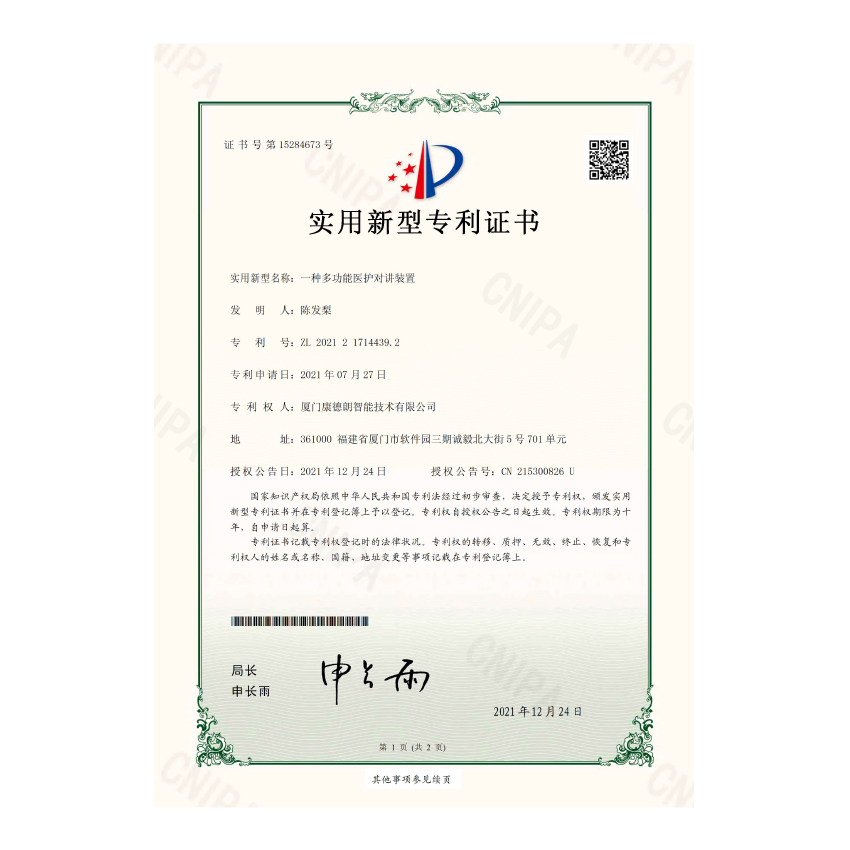 養(yǎng)老監(jiān)護可視對講實用新型專利證書