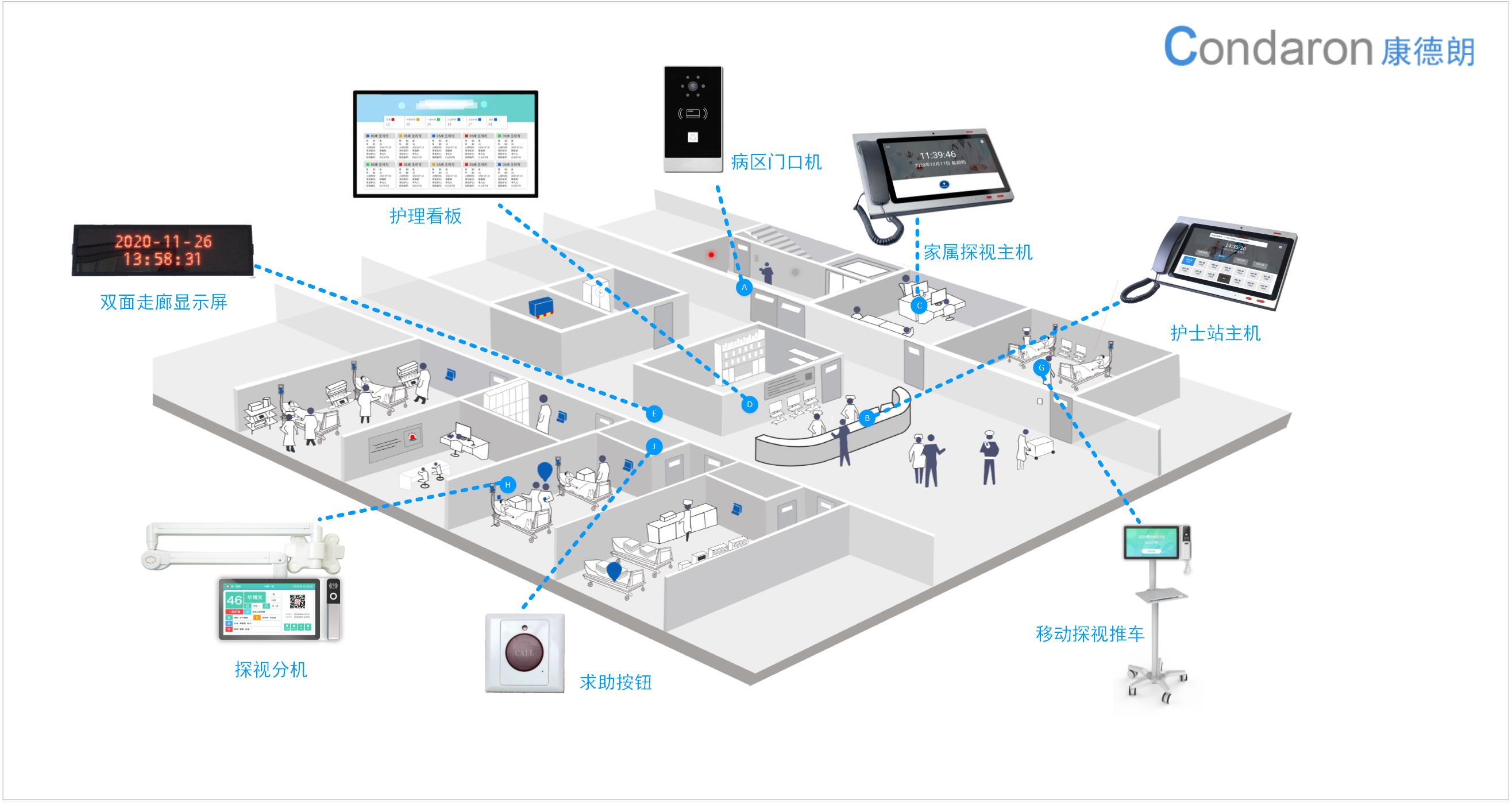 病房門(mén)口:病房門(mén)口主要部署病房門(mén)口機(jī)、三色門(mén)燈等設(shè)備。